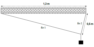 Um bloco está sendo sustentado pelos fios 1 e 2, como mostrado na figura. Os fios fazem um ângulo reto entre si. Sendo T₁ e T₂ os módulos das tensões nos fios 1 e 2, respectivamente, qual é o valor da razão T₁/T₂ ?
