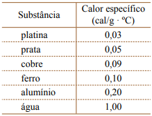 Considerando o sistema termicamente isolado e os valores mostrados na tabela, pode-se afirmar corretamente que a esfera metálica é constituída de
