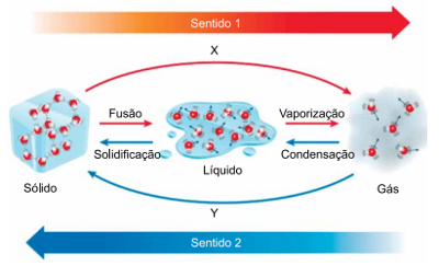 O ciclo da água na natureza ocorre por meio das mudanças de estado físico dessa substância, representadas na figura.