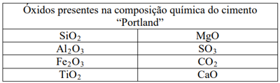 O cimento “Portland” é o mais utilizado na construção civil devido ao custo benefício (ser relativamente barato e apresentar alta resistência). Sua composição química é uma mistura de óxidos (tabela abaixo). Baseando-se nos óxidos apresentados, analise a proposição abaixo e assinale V (verdadeiro) ou F (falso) para a alternativa.