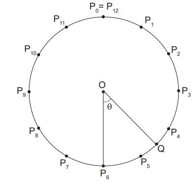 Um círculo de centro O é dividido em 12 arcos iguais pelos pontos P₀, P₁, P₂, P₃, P₄, P₅, P₆, P₇, P₈, P₉, P₁₀, P₁₁, P₁₂ = P₀. Seja Q o ponto médio do arco P₄P₅. Considere q o ângulo entre os segmentos OQ e OP₆.