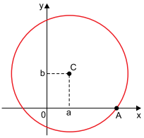 A circunferência de equação (x – 2)² + (y – 3)² = 25, com centro C, intersecta o eixo x no ponto A, conforme mostra a figura.