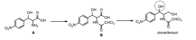 01) Na reação de formação do cloranfenicol a partir do composto B, ocorre a redução do ácido carboxílico.