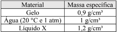 Ao colocarmos cubos de gelo em um copo contendo água líquida (20º) notamos que, imediatamente, antes que as trocas de calor sejam suficientes para derreter o gelo, o sólido flutua com parte de seu volume abaixo do nível do líquido e parte de seu volume acima do nível do líquido. A flutuação ocorre porque o empuxo sobre o gelo ocasionado pelo líquido é igual à força gravitacional que age sobre o cubo de gelo. A partir dos dados oferecidos na tabela e dos conceitos relacionados à flutuação, assinale V (verdadeiro) ou F (falso) para a alternativa.