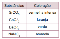 Em comemorações, como no início de um novo ano, são utilizados fogos de artifício que colorem e enfeitam o céu devido à presença de substâncias químicas em sua composição. São os metais em forma de íons que produzem as diferentes cores na explosão desses fogos. As substâncias e suas respectivas colorações estão apresentadas na tabela: