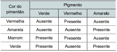 As cores dos pimentões são definidas pelos genes D e R que se segregam independentemente, havendo dominância completa entre seus respectivos alelos. Na casca desses frutos, o alelo D não permite a produção de pigmento verde e o alelo d permite a produção desse pigmento. O alelo R determina a produção de pigmento vermelho e o alelo r a produção de pigmento amarelo. No quadro constam as possíveis cores dos pimentões conforme a composição de pigmentos na casca desses frutos.