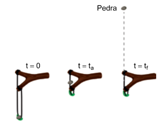 Uma criança, brincando com um estilingue, lança uma pedra verticalmente para cima. Na figura estão ilustrados três momentos desse lançamento: o momento t = 0, no qual a criança está na iminência de lançar a pedra, o momento t = tₐ, no qual a pedra abandona o elástico do estilingue, e o momento