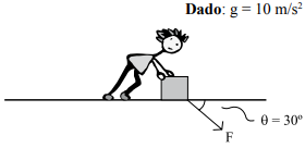 Uma criança empurra uma caixa de 2 kg sobre um piso horizontal, sem atrito. Ela exerce uma força constante, de intensidade igual a 30 N, para baixo, como mostra a figura, fazendo um ângulo de 30º com a horizontal, e comprime o bloco contra o piso. Nessa situação, a força normal que o piso exerce sobre o bloco terá módulo, em N, igual a