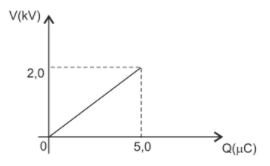 Considerando-se que a diferença de potencial V entre as placas de um capacitor depende da carga Q, como mostra o gráfico da figura, a energia armazenada nesse capacitor, em mJ, é igual a