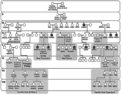 A Figura abaixo é o heredograma para a hemofilia nas famílias reais da Europa.