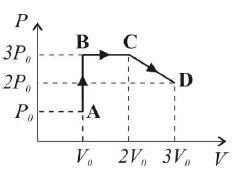 O diagrama P x V abaixo ilustra uma sequência de processos termodinâmicos executada por um gás ideal monoatômico, passando pelos pontos A, B, C e D, caracterizados pelos valores de pressão e volume apresentados no diagrama.