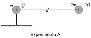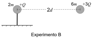 Em dois experimentos, A e B, uma partícula foi fixada à esquerda e outra partícula à direita foi solta com velocidade nula, conforme geometrias apresentadas nas figuras acima. Em cada experimento, mediu-se a velocidade final que a partícula da direita alcançou muito tempo após ser solta.