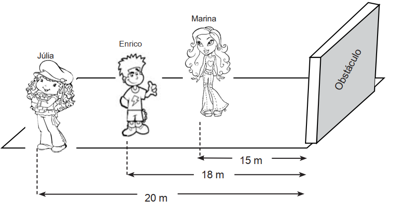 Júlia, Marina e Enrico estão brincando em frente a um obstáculo e se encontram distanciados conforme figura a seguir. Estando eles não alinhados e considerando a velocidade do som, no ar, de 340 m/s, quando Enrico emite um som, o eco pode ser escutado perfeitamente apenas por