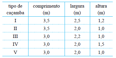 A tabela apresenta as dimensões de cinco tipos de caçambas encontradas no mercado pelo proprietário.