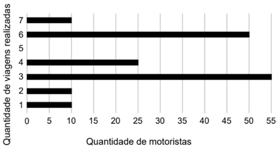 Uma empresa de transporte faz regularmente um levantamento do número de viagens realizadas durante o dia por todos os 160 motoristas cadastrados em seu aplicativo. Em um certo dia, foi gerado um relatório, por meio de um gráfico de barras, no qual se relacionaram a quantidade de motoristas com a quantidade de viagens realizadas até aquele instante do dia.