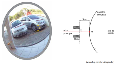 Na entrada de uma loja de conveniência de um posto de combustível, há um espelho convexo utilizado para monitorar a região externa da loja, como representado na figura. A distância focal desse espelho tem módulo igual a 0,6 m e, na figura, pode-se ver a imagem de dois veículos que estão estacionados paralelamente e em frente à loja, aproximadamente a 3 m de distância do vértice do espelho.