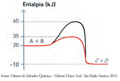 A equação química A + B → C + D pode ocorrer por meio de dois caminhos reacionais diferentes: um na presença e outro na ausência de catalisador. Esses dois caminhos estão representados no diagrama abaixo.
