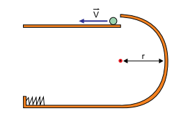 Uma esfera, de massa 200 g e raio desprezível, está em repouso e encostada em uma mola de constante elástica 10000 N/m, que se encontra comprimida em 2 cm. A mola é liberada, impulsionando a esfera que se move sem atritos em uma canaleta inicialmente horizontal. Pouco mais adiante, a canaleta se encurva segundo um arco de circunferência de raio r, que conduz a esfera a outra canaleta horizontal, onde se movimenta com velocidade constante de 4 m/s.