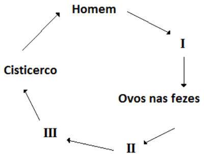 Os números I, II e III do ciclo de vida da tênia são, respectivamente: