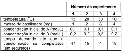 Um estudante desejava estudar, experimentalmente, o efeito da temperatura sobre a velocidade de uma transformação química. Essa transformação pode ser representada por: