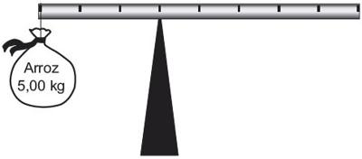 Em um experimento, um professor levou para a sala de aula um saco de arroz, um pedaço de madeira triangular e uma barra de ferro cilíndrica e homogênea. Ele propôs que fizessem a medição da massa da barra utilizando esses objetos. Para isso, os alunos fizeram marcações na barra, dividindo-a em oito partes iguais, e em seguida apoiaram-na sobre a base triangular, com o saco de arroz pendurado em uma de suas extremidades, até atingir a situação de equilíbrio.