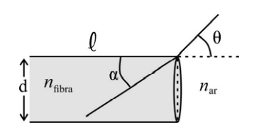 . Considere, ainda, que os ângulos θ e α sejam, respectivamente, ângulo de incidência e ângulo de refração da luz com relação à extremidade superior da fibra.