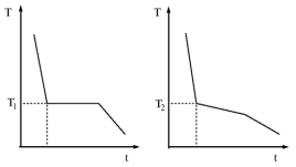 As figuras abaixo representam a variação da temperatura, em função do tempo, no resfriamento de água líquida e de uma solução aquosa de sal.