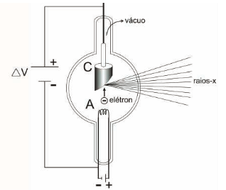 No tubo, sob vácuo, elétrons são produzidos no filamento A e acelerados para o eletrodo C, devido à diferença de potencial ∆V. Os elétrons acelerados colidem com o eletrodo transferindo-lhe sua energia e produzindo os raios X.