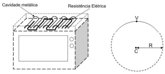 A imagem da direita ilustra a seção reta do perfil da cavidade metálica (linha contínua), onde C é o centro da circunferência (linha tracejada) de raio R, da qual a cavidade se origina. O ponto V. é o ponto médio do perfil da cavidade. Deseja-se posicionar a resistência ao longo da linha que passa pelos pontos V. e C a fim de promover o aquecimento uniforme ao longo da bandeja do forno.
