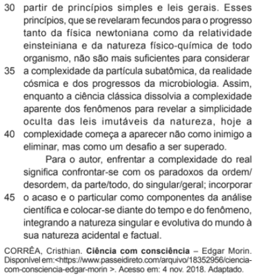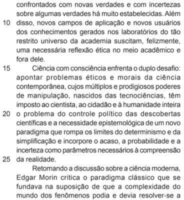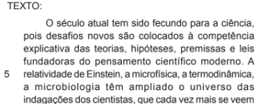 No fragmento “O século atual tem sido fecundo para a ciência, pois desafios novos são colocados à competência explicativa das teorias, hipóteses, premissas e leis fundadoras do pensamento científico moderno. A relatividade de Einstein, a microfísica, a termodinâmica, a microbiologia têm ampliado o universo das indagações dos cientistas, que cada vez mais se veem confrontados com novas verdades e com incertezas sobre algumas verdades há muito estabelecidas.”, o argumento utilizado pela voz autoral é considerado