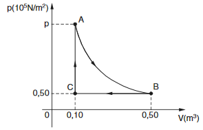 Um gás sofre a transformação termodinâmica cíclica ABCA representada no gráfico p × V. No trecho AB a transformação é isotérmica.