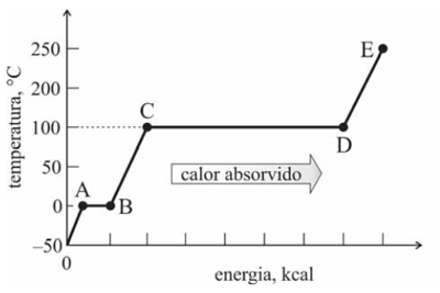 O gráfico acima apresenta a variação da temperatura, em °C, em função da energia, em kcal, que é fornecida para transformar 1 kg de água solidificada (gelo), inicialmente a -50 °C, em vapor, a 250 °C. Nesse gráfico, os segmentos AB e CD são horizontais.
