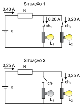Duas lâmpadas desse tipo, L₁ e L₂, uma bateria ideal, de força eletromotriz ε, um resistor ôhmico, de resistência R, e duas chaves interruptoras, ch₁ e ch₂, compõem um circuito elétrico. Nesse circuito, quando as duas lâmpadas estão acesas, a corrente elétrica no resistor é de 0,40 A (situação 1), e, quando apenas uma das lâmpadas está acesa, a corrente no resistor passa a ser de 0,25 A (situação 2).