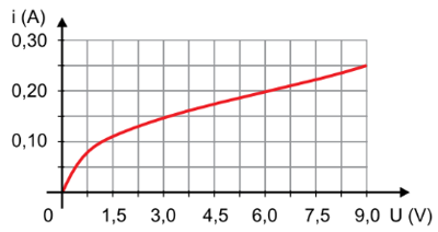 O gráfico mostra a variação da corrente elétrica que se estabelece em determinado tipo de lâmpada não ôhmica em função da diferença de potencial aplicada entre seus terminais.