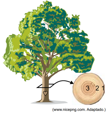 A figura ilustra uma árvore cujo tronco foi seccionado. O detalhe mostra os anéis de crescimento produzidos durante 30 anos de vida dessa árvore.