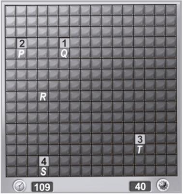 Em sua próxima jogada, o jogador deve escolher dentre os quadrados marcados com as letras P, Q, R, S e T um para abrir, sendo que deve escolher aquele com a menor probabilidade de conter uma mina.