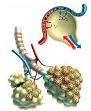 A figura ilustra o processo de hematose nos alvéolos pulmonares humanos.
