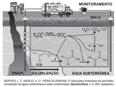 A figura ilustra esquematicamente um processo de remediação de solos contaminados com tricloroeteno (TCE), um agente desengraxante. Em razão de vazamentos de tanques de estocagem ou de manejo inapropriado de resíduos industriais, ele se encontra presente em águas subterrâneas, nas quais forma uma fase líquida densa não aquosa (DNAPL) que se deposita no fundo do aquífero. Essa tecnologia de descontaminação emprega o íon persulfato (S₂O₈²⁻), que é convertido no radical ·SO₄⁻ por minerais que contêm Fe(Ill). O esquema representa de forma simplificada o mecanismo de ação química sobre o TCE e a formação dos produtos de degradação.