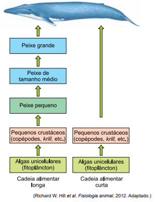 A ilustração mostra duas possíveis cadeias alimentares de uma baleia jubarte. Na natureza, porém, o que se efetiva é a cadeia alimentar curta, ou seja, as baleias se alimentam de pequenos crustáceos e não de peixes grandes. A cadeia alimentar longa é uma cadeia hipotética.