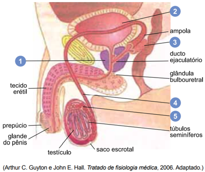 Os órgãos internos do sistema urogenital masculino responsáveis por produzir secreção nutritiva para os espermatozoides e completar a maturação dos espermatozoides estão indicados, correta e respectivamente, pelos números