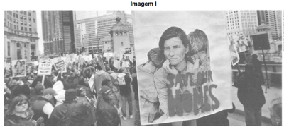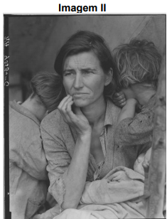 As imagens abaixo correspondem a dois momentos distintos da história dos Estados Unidos. Na primeira delas, nota-se uma manifestação ocorrida na cidade de Chicago, em 2009, acerca da crise econômica que atingia a população americana. Nessa manifestação, destaca-se a utilização de uma célebre fotografia que registrou, no passado, o desalento da população rural americana no contexto da crise econômica de 1929, sobre a qual se lê a frase “salvem nossos lares”. Trata-se da fotografia intitulada “Mãe migrante”, de Dorothea Lange, do ano de 1936, conforme apresentado na imagem II.