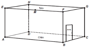 A lagartixa parte do ponto B e vai até o ponto A. A seguir, de A ela se desloca, pela parede, até o ponto M, que é o ponto médio do segmento EF. Finalmente, pelo teto, ela vai do ponto M até o ponto H. Considere que todos esses deslocamentos foram feitos pelo caminho de menor distância entre os respectivos pontos envolvidos.