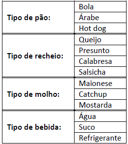 Uma lanchonete oferece a seus clientes as seguintes opções para compor um lanche: