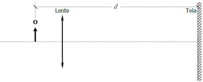Uma lente delgada convergente é posicionada de tal maneira que produz uma imagem de um objeto O exatamente sobre uma tela situada à distância d =1,80 m do objeto. A imagem é ampliada cinco vezes em relação ao tamanho do