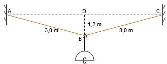 Uma luminária com peso de 76 N está suspensa por um aro e por dois fios ideais. No esquema, as retas AB e BC representam os fios, cada um medindo 3 m, e D corresponde ao ponto médio entre A e C.