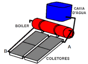 A luz solar que atinge a parte superior da atmosfera terrestre chega a uma taxa constante de 135,2 mW/cm². Dessa radiação, apenas 50% conseguem chegar à superfície, pois parte dela é refletida pelas nuvens e absorvida pela atmosfera. A radiação solar pode ser aproveitada para aquecer água de reservatórios, entre outras aplicações. Um sistema básico para transformar energia solar em térmica é ilustrado na figura ao lado acima. Esse sistema é constituído de coletores solares e de um reservatório térmico, chamado boiler. Os coletores solares, geralmente, são feitos de materiais que absorvem bem a radiação solar, e o calor gerado nos coletores é transferido para a água que circula no interior de suas tubulações de cobre. A água aquecida é armazenada no boiler. Dessa forma, a água é mantida quente para consumo posterior. A caixa de água fria alimenta o boiler, mantendo-o sempre cheio.