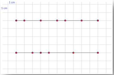 Em uma malha, formada por quadrados de lado medindo 1 cm, foram traçados dois segmentos paralelos, tendo um deles 7 pontos em destaque, e o outro 6, conforme indica a figura.
