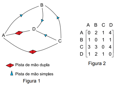 Durante período de obras na malha viária descrita, a pista de rodagem entre os marcos A e D passou a ser de mão simples (sentido de A para D), e a pista do marco C para o marco D, ainda que tenha permanecido com mão simples, teve seu sentido invertido, passando a ser de D para C. Comparando os 16 elementos da matriz da figura 2 com seus correspondentes na matriz da nova configuração de malha viária, a quantidade de elementos que mudarão de valor é igual a