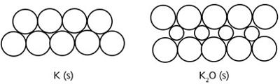 1. Suponha que, nestes desenhos, estão representados os átomos de potássio na rede cristalina do metal puro, K (s), e do óxido de potássio, K2O (s), de acordo com o modelo de Dalton: