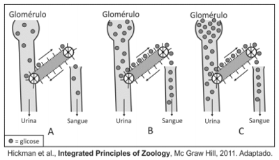 O mecanismo de reabsorção renal da glicose pode ser comparado com o que acontece numa esteira rolante que se move a uma velocidade constante, como representado na figura abaixo. Quando a concentração de glicose no filtrado glomerular é baixa (A), a “esteira rolante” trabalha com folga e toda a glicose é reabsorvida. Quando a concentração de glicose no filtrado glomerular aumenta e atinge determinado nível (B), a “esteira rolante” trabalha com todos os compartimentos ocupados, ou seja, com sua capacidade máxima de transporte, permitindo a reabsorção da glicose. Se a concentração de glicose no filtrado ultrapassa esse limiar (C), como ocorre em pessoas com diabetes melito, parte da glicose escapa do transporte e aparece na urina.